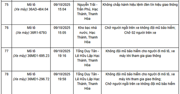 Tại tỉnh Thanh Hoá, trong khoảng thời gian từ ngày 6 đến ngày 10 tháng 10 năm 2025, lực lượng Cảnh sát giao thông đã ghi nhận nhiều trường hợp xe máy vi phạm qua hệ thống camera giám sát đặt trên các tuyến đường trọng điểm. Danh sách các biển số xe vi phạm được công khai nhằm mục đích thông báo rộng rãi và tạo điều kiện cho các chủ xe nhanh chóng hoàn thành nghĩa vụ nộp phạt. Việc công bố danh sách cũng là hình thức tuyên truyền, nhắc nhở cộng đồng chú ý tuân thủ luật lệ giao thông để đảm bảo an toàn cho bản thân và xã hội.