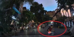 Nam sinh buông tay khi đi xe đạp gây nguy hiểm trước ô tô ở Hà Nội